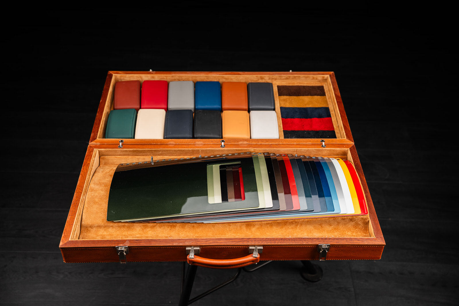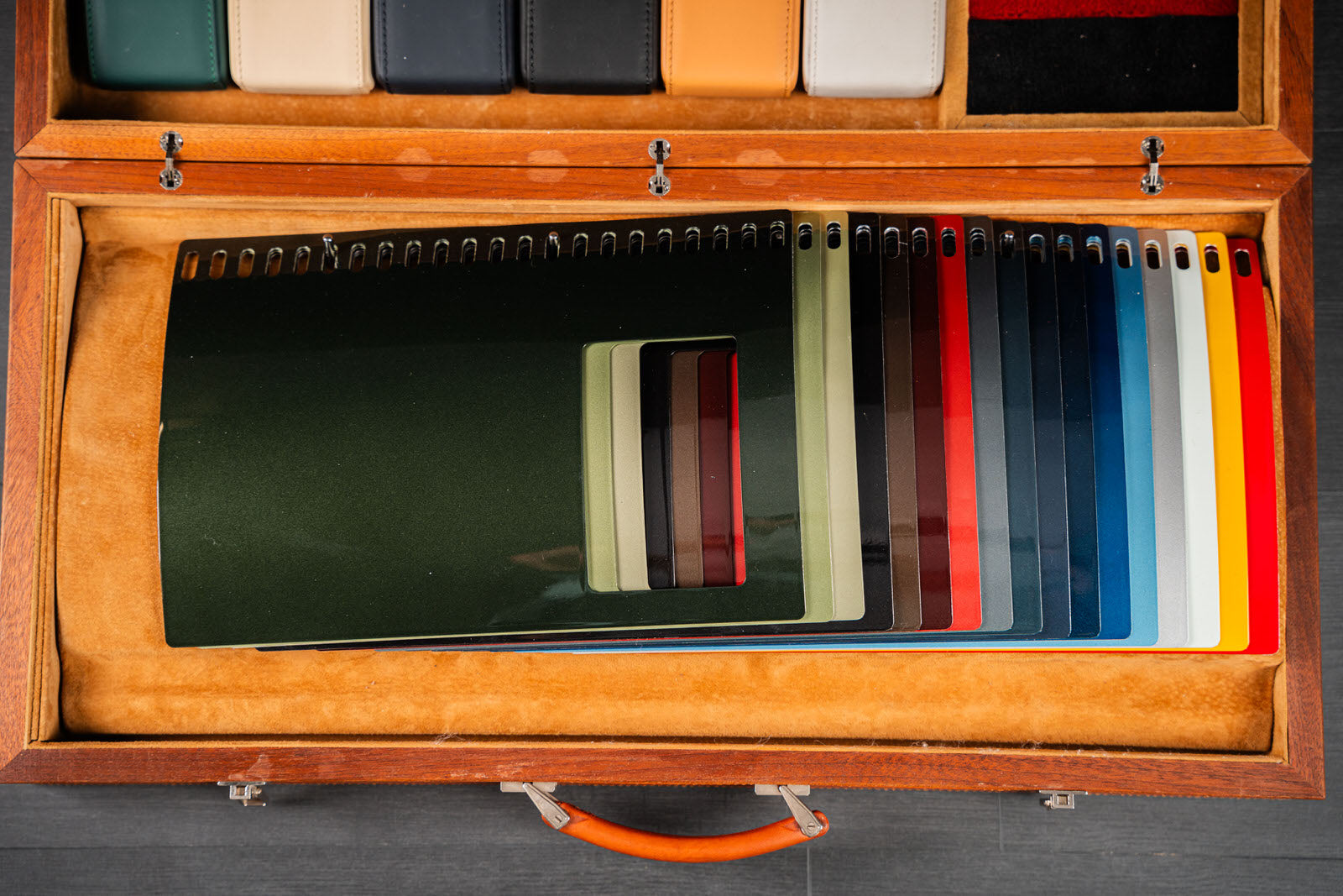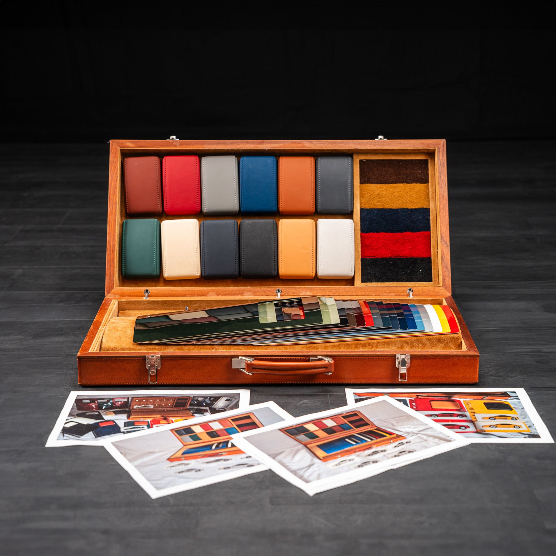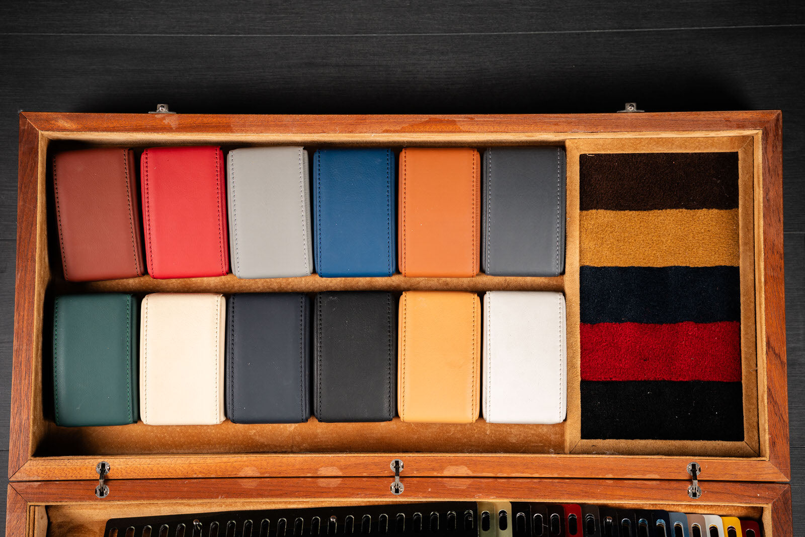 A rare leather-bound presentation case by Schedoni for Ferrari dealers in the 1990s, containing paint, leather, fabric, carpet, and stitching samples. Used to help clients configure their cars before digital tools, it’s a collectible piece of Ferrari craftsmanship and showroom history.