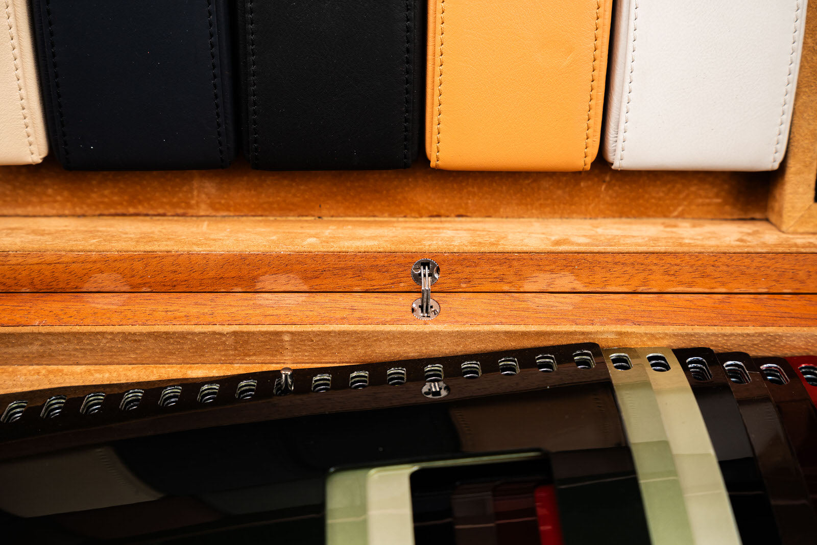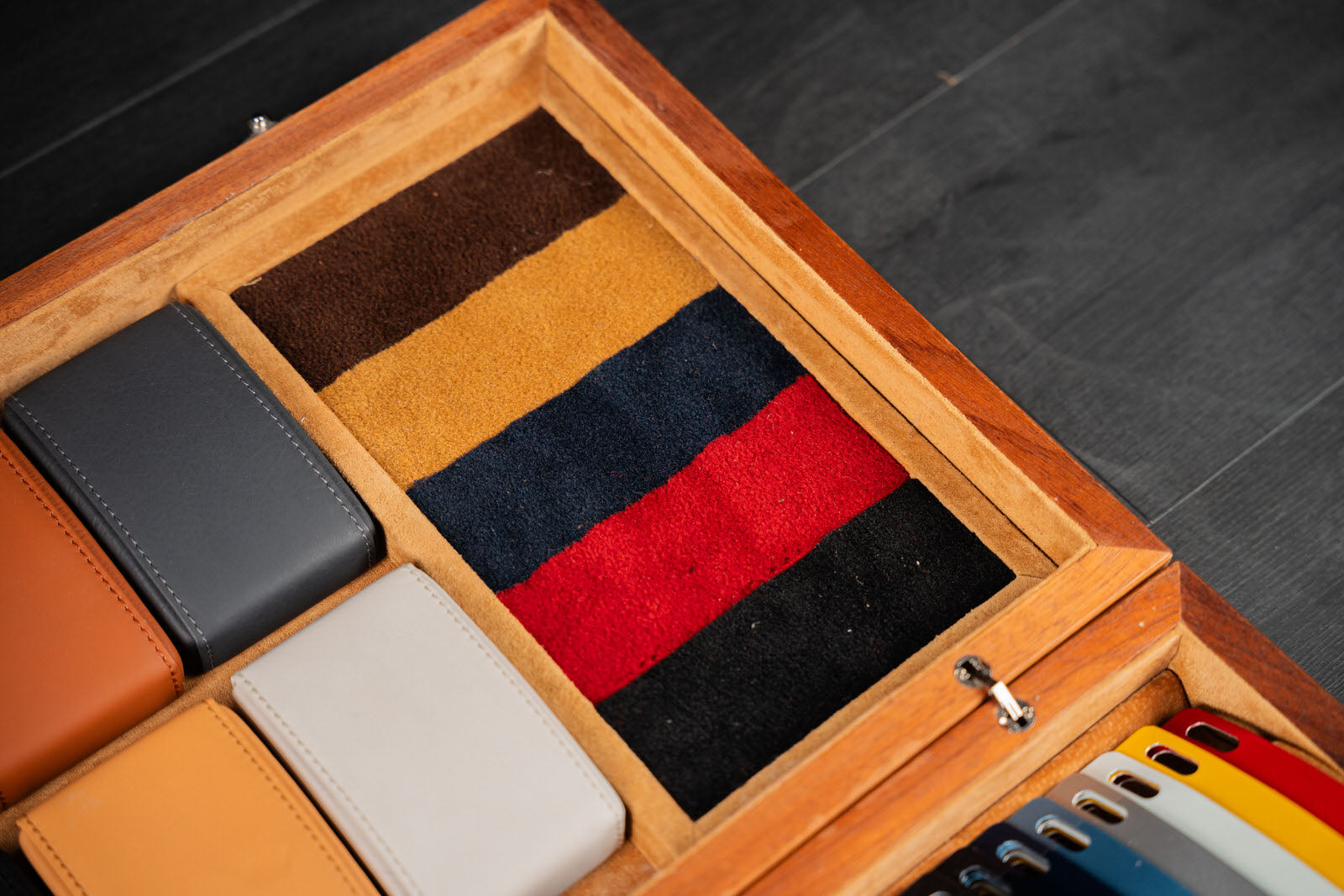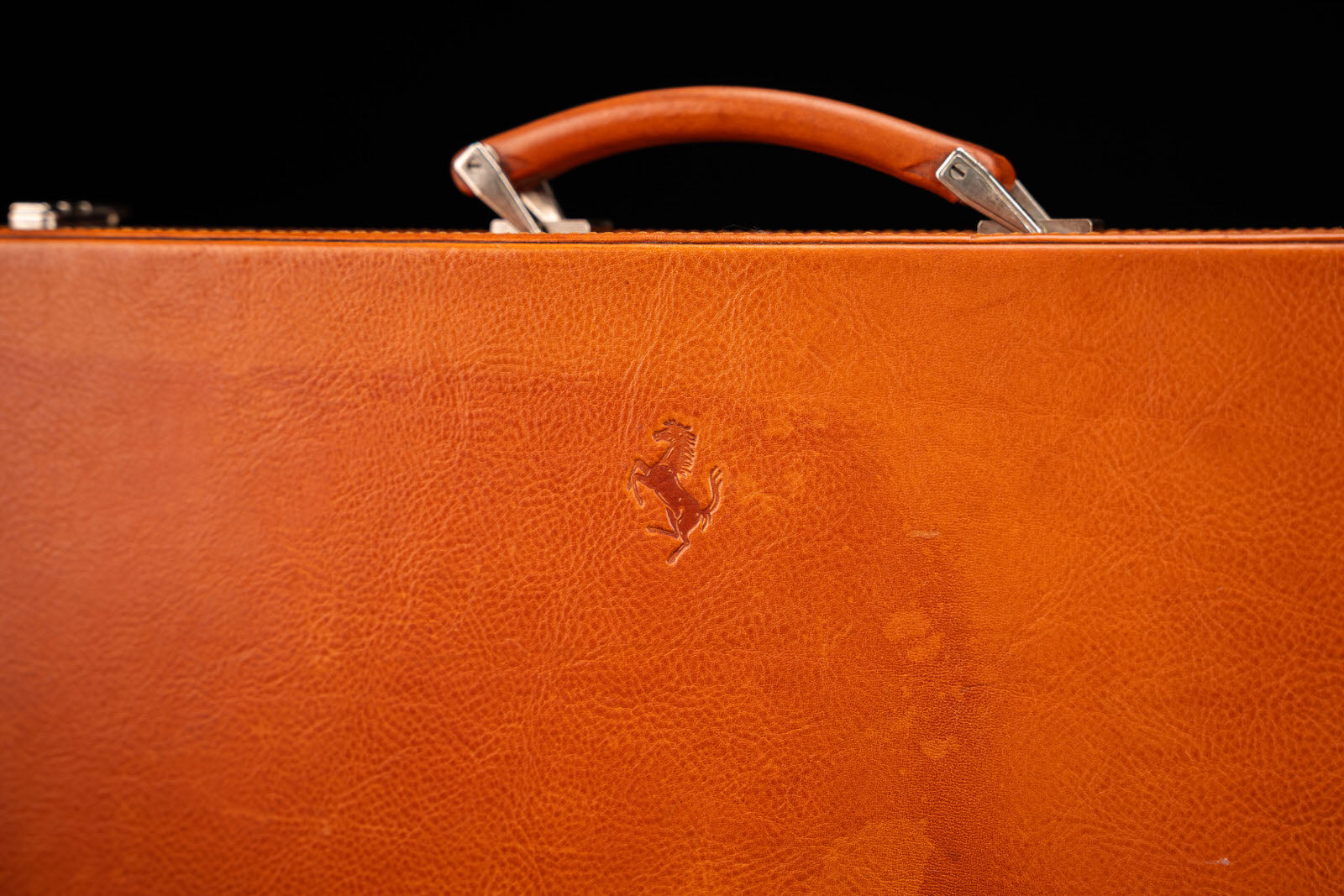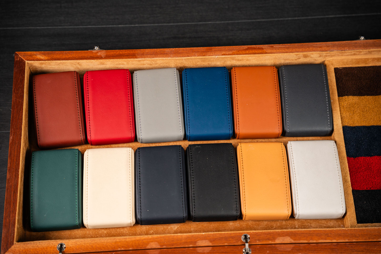A rare leather-bound presentation case by Schedoni for Ferrari dealers in the 1990s, containing paint, leather, fabric, carpet, and stitching samples. Used to help clients configure their cars before digital tools, it’s a collectible piece of Ferrari craftsmanship and showroom history.