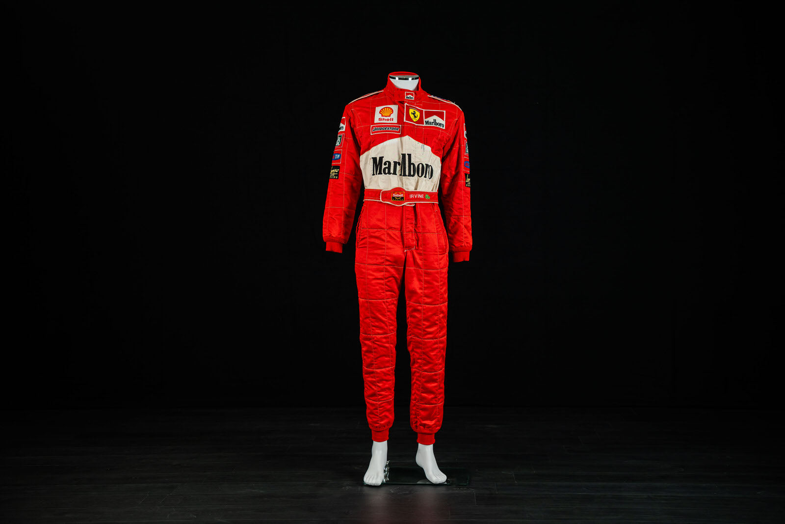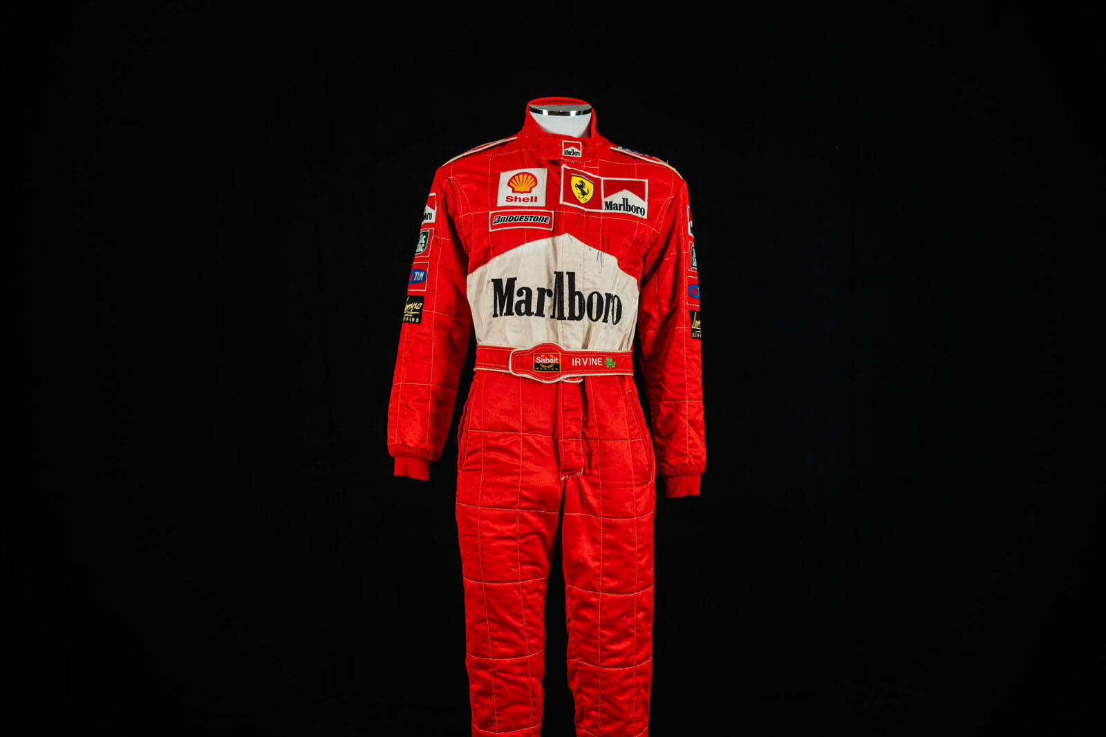An original Scuderia Ferrari race suit from the 1999 Formula 1 season, signed by Eddie Irvine. Finished in Ferrari red, it features official sponsor logos including Marlboro, Shell, and Bridgestone. Made by Sabelt in fire-resistant Nomex, this overall represents Irvine’s most successful F1 season—where he won four races and narrowly missed the world championship—making it a prized collector’s item.