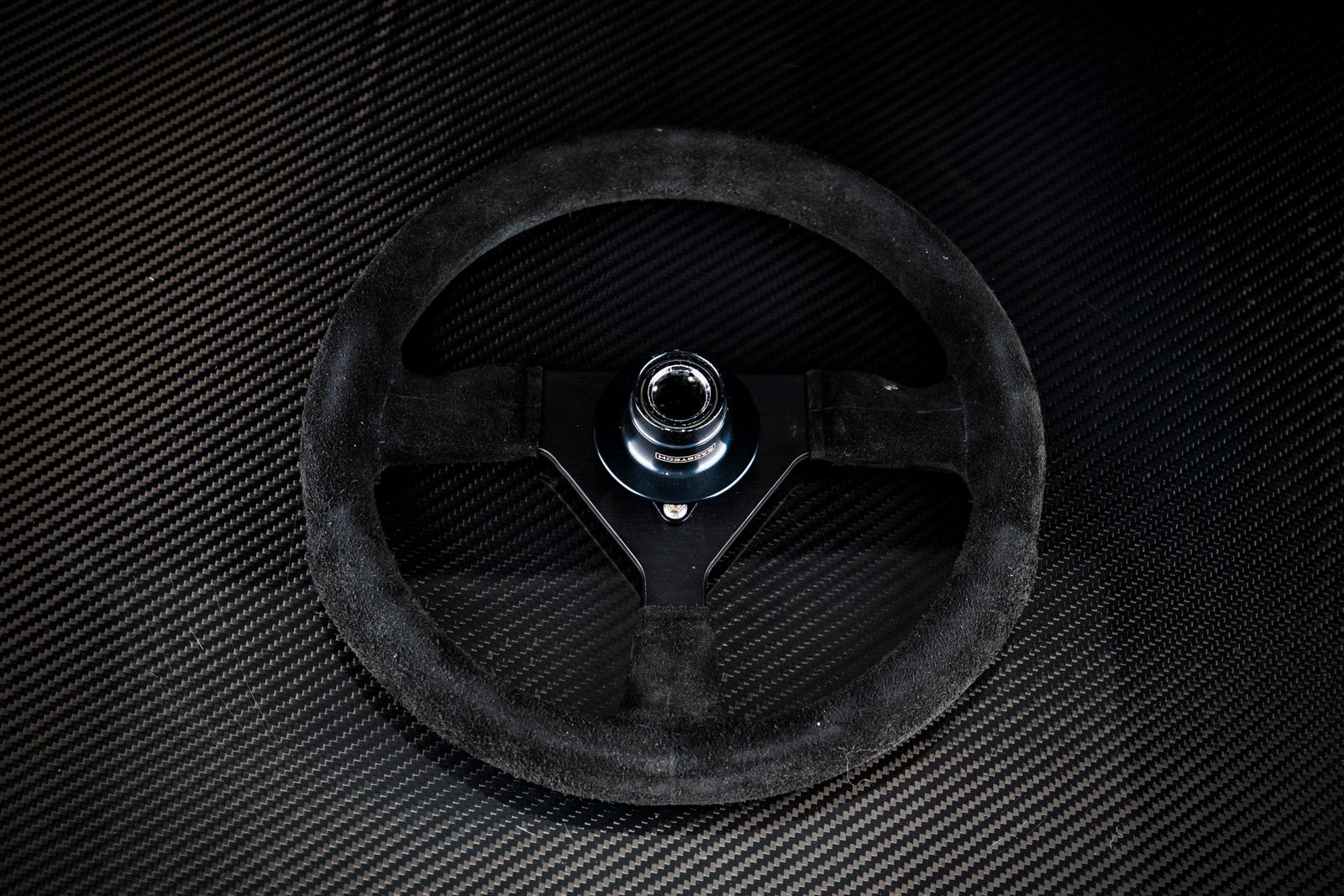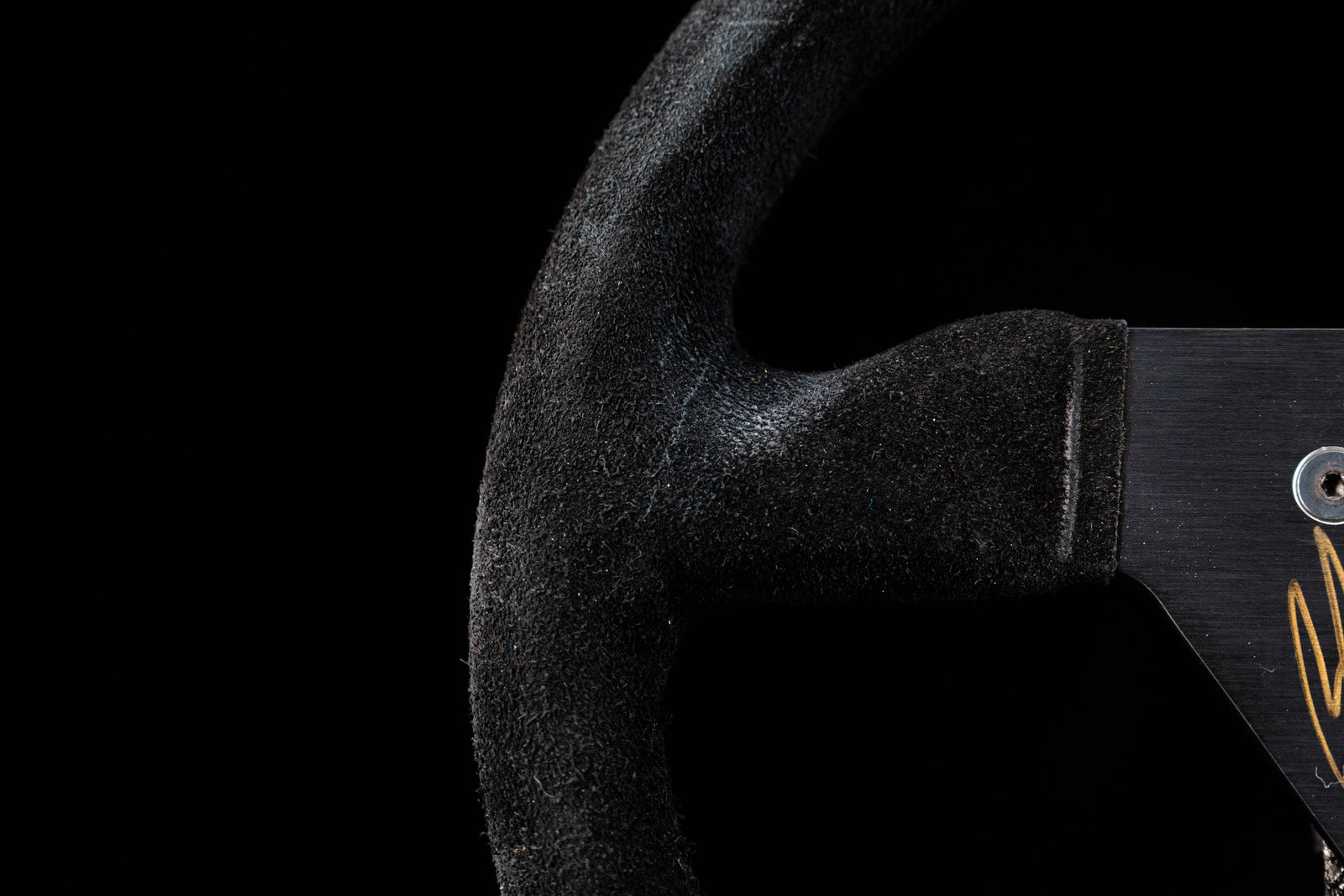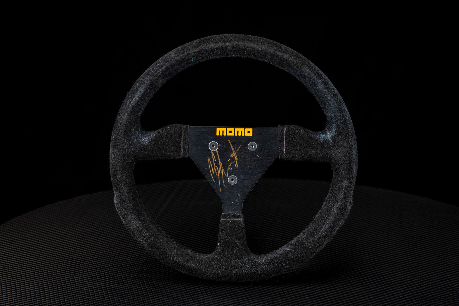 A rare signed steering wheel from Michael Schumacher’s 1993 Benetton-Ford F1 car. Featuring ergonomic grips, paddle shifters, and period-correct buttons, it’s finished in black suede. Schumacher’s autograph adds unique collector value to this piece of early F1 technology from his rising career.